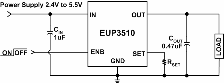 The EUP3510/3511 are Current Limited P-channel MOSFET power switches designed for high-side loadswitching applications. The internal current-limiting circuit protects the input supply against large output short circuit current which may cause the supply to fall out of regulation. The current limit threshold is programmed with an external resistor from SET Pin to ground. The quiescent supply current is typically 8μA, making the device ideal for portable battery-operated equipment. In shutdown mode, the supply current decreases to less than 0.1μA. Additional features include thermal shutdown to prevent catastrophic switch failure from high current loads, under-voltage lockout (UVLO) to ensure that the device remains off unless there is a valid input voltage present.