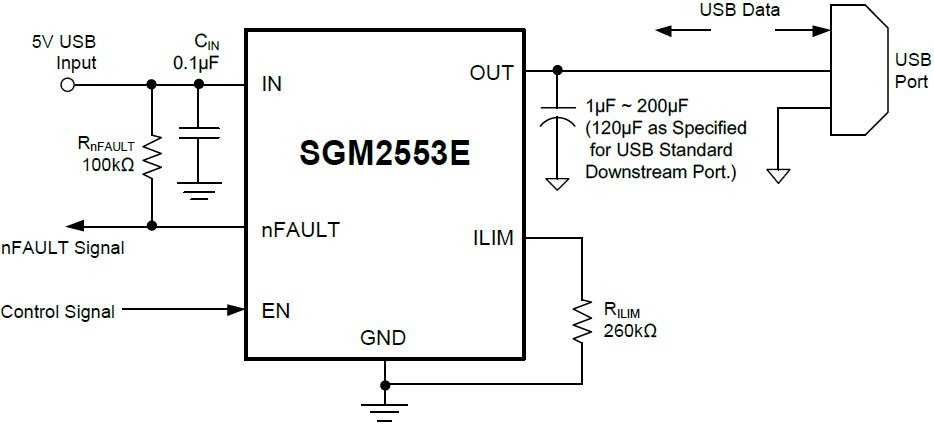 The SGM2553E power distribution switch is intended for applications where precision current limiting is required or heavy capacitive loads and short circuits are encountered and provides up to 0.2A of continuous load current. This device offers a programmable current limit threshold between 100mA and 200mA via an external resistor. The power switch rise and fall times are controlled to minimize current surges during turn on/off. The SGM2553E has quick auto-discharge function in disable status.