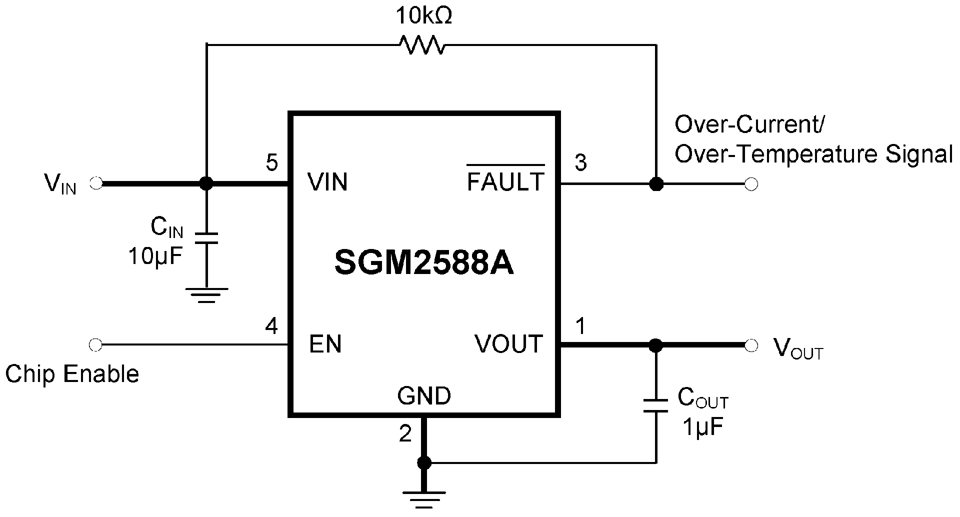 This device employs soft-start circuit that minimizes inrush current in applications where highly capacitive loads are employed. An open drain FAULT flag asserts low during overcurrent and thermal conditions after a 13ms blanking time to prevent false reporting. SGM2588 is available in the Green SOT-23-5 package. It is rated over the -40℃ to +85℃ temperature range.