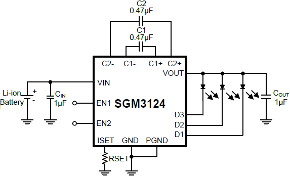 The SGM3124 is capable of driving up to three channels of LEDs at 30mA per channel from a 2.7V to 5.5V input. Additionally, the current controlled charge pump ensures low input current ripple and EMI. A low external part count (two 0.47μF flying capacitors and two small 1μF capacitors at VIN and VOUT) makes this part ideally suited for small, battery-powered applications.