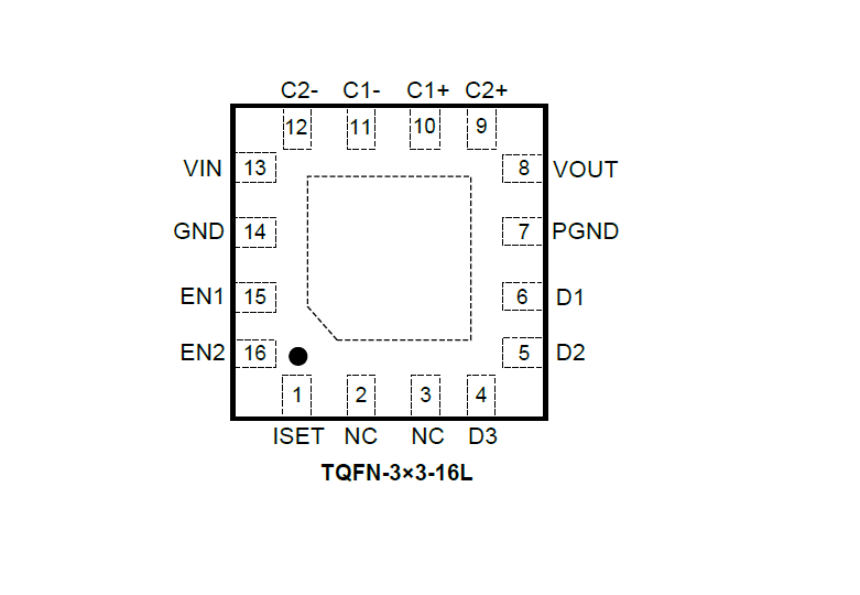 The device provides a constant current for each LED, and the initial current value can be set by an external resistor. High efficiency is achieved by utilizing a 1×/1.5× fractional conversion technique in combination with very low dropout current sources.