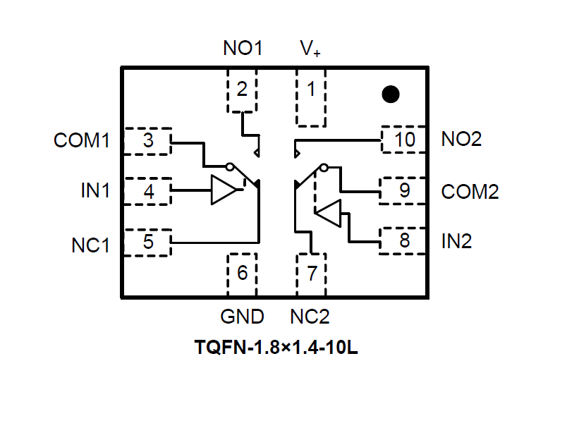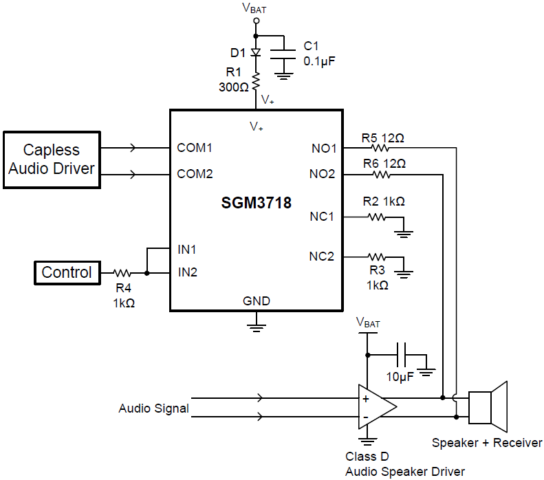 The SGM3718 has excellent on-resistance matching (0.22Ω MAX) between switches and guarantees excellent on-resistance flatness over all signal range (0.22Ω MAX). This ensures excellent linearity and low distortion when switching audio signals. The SGM3718 is a committed dual single-pole/doublethrow (SPDT) that consist of two normally open (NO) and two normally closed (NC) switches. This configuration can be used as a dual 2-to-1 multiplexer.