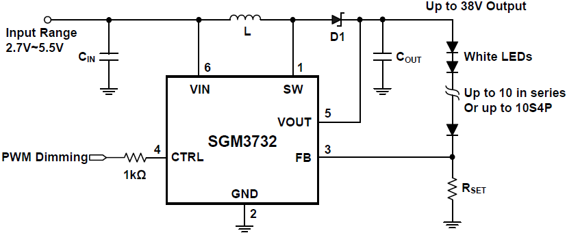 Various protection features are built into the SGM3732, including cycle-by-cycle input current limit protection, open LED (output over-voltage) protection and thermal shutdown protection. The leakage current in shutdown mode is less than 1μA.