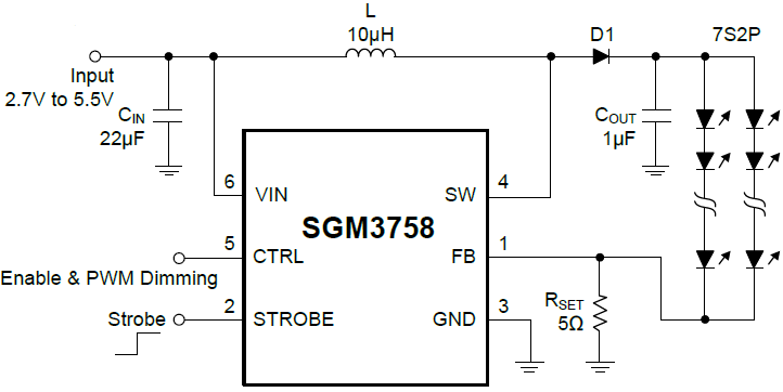 With a 40V rated integrated switch FET, the SGM3758 is a boost converter that drives LEDs in series. The boost converter has a 40V, 3A internal MOSFET; thus it can drive single or parallel LED strings for small to large size panel backlighting. And it is quite suitable for smart phone image capture using display device as a flash mode light source, as it can output up to 200mA current at 30V for 320ms when the strobe signal is active.
