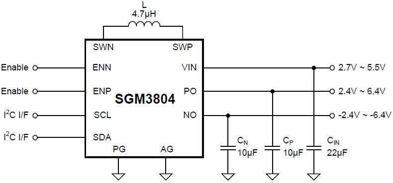 The SGM3804 generates both positive and negative precision regulated voltage power sources, with a patent pending control scheme for single inductor dual output converter. Outputs are programmable in 100mV steps in 2.4V to 6.4V range, which are commonly used in drivers for LCD displays and AMOLED displays, as well as in any other circuits requiring both rails, with different loading on each rail. The device is equipped with I2C interface. With input in the range of 2.7V to 5.5V, the device is optimized for loading 100mA in boost-inverter mode and also works in buck-inverter mode.