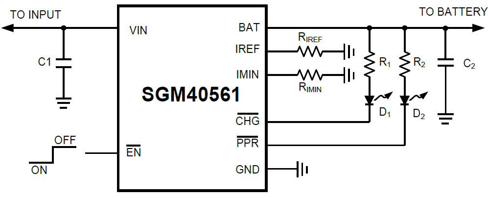 The charge current and the full-of-charge (FOC) current are programmable with external resistors. When the battery voltage is lower than typically 2.55V (SGM40561-4.2), 2.62V (SGM40561-4.3) or 2.65V (SGM40561-4.35), the charger preconditions the battery with typically 19% of the programmed charge current. When the charge current reduces to the programmable FOC current level during the CV charge phase, an FOC indication is provided by the CHG pin, which is an open-drain output. An internal thermal foldback function protects the charger from any thermal failure.