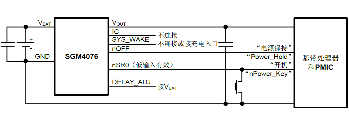 SGM4076為全新設計冷復位電池脫離開關。該電路用來保證裝箱時電池處于近乎與負載脫離的狀態,用于延長成品倉儲時間,實現開盒即用、改善客戶感受,方便殼體和包裝的靈活設計。僅使用“開機”和“電源保持”信號配合即可實現電池脫離動作和電池開通動作。必要時還可以利用其電池脫離功能完成掉電重啟循環。