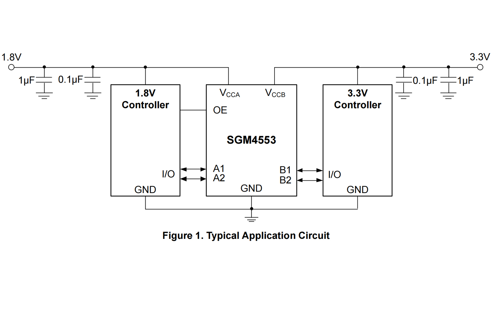 The SGM4553 is a 2-bit, non-inverting, bidirectional voltage-level translator which features two independent configurable power-supply lines. The A and B ports track the VCCA supply and VCCB supply respectively. The supply voltage range is 1.65V to 5.5V for A ports and 2.3V to 5.5V for B ports. The device provides a bidirectional translation function between the different voltage nodes (including 1.8V, 2.5V, 3.3V and 5V).