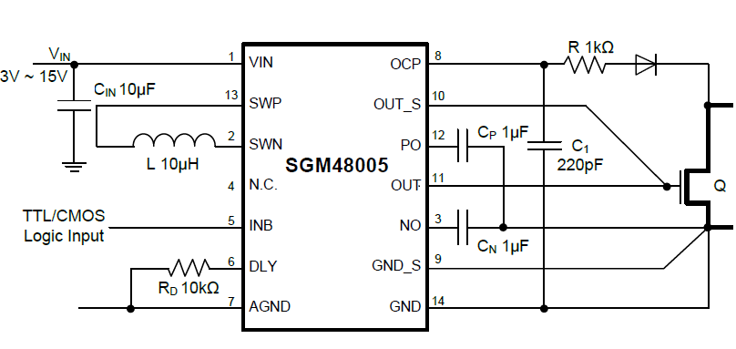 The SGM48005 is a high current MOSFET driver with a dual power rail generation circuit using a single inductor for getting both positive rail and negative rail. With its unique overshoot cancellation mechanism and its extended precision power rails, the SGM48005 drives the gate with no series damping resistor for sharp and clean rise and fall seen at the gate, which is important for high power design of switch mode power supplies running faster than a few hundred kHz. The adaptive overshoot cancellation allows placing the driver in a different location (temperature zone) from the power MOSFET’s, which simplifies circuit layout and cooling. The inverted input buffer is out of phase with the ground bouncing. Along with its current and voltage hysteresis, this assures high noise immunity and easy input signal coupling. The propagation delay of input low to output high is programmed with a resistor, for pairing switches in totem pole with no shooting through. The saturation voltage of power switch is sensed for over-current protection.
