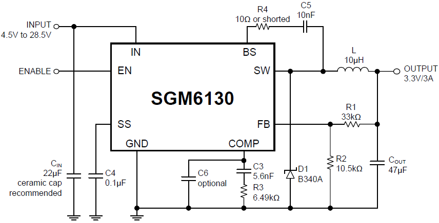 The SGM6130 is a current-mode step-down regulator with an internal power MOSFET. This device achieves 3A continuous output current over a wide input supply range from 4.5V to 28.5V with excellent load and line regulations. The switching frequency of SGM6130 is 385kHz and current mode operation provides fast transient response and eases loop stabilization.