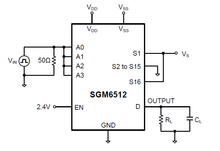 The SGM6512 is a high speed monolithic analog multiplexer comprising of 16 single channels. The SGM6512 switches one of 16 inputs to a common output, as determined by the 4-bit binary address lines (A0, A1, A2 and A3). An EN input enables or disables the device. When disabled, all channels switch off; when enabled, each channel conducts equally well in both directions and has an input signal range that extends to the supplies.