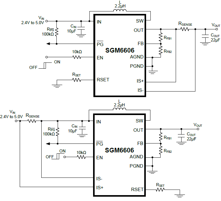 The SGM6606 is a high current, synchronous step-up regulator with a programmable input or output current limit. It is ideal to prevent the output current of SGM6606 from overloading or it limits the input current from battery or power source in standard interface, such as PCMCIA, PCI-E. The SGM6606's internal compensation is optimized for the large output capacitors needed to support the output voltage during large load pulses. The SGM6606 can set the loading current.