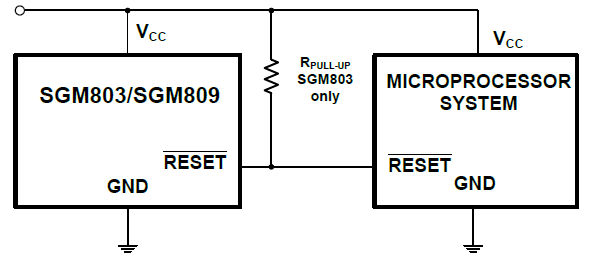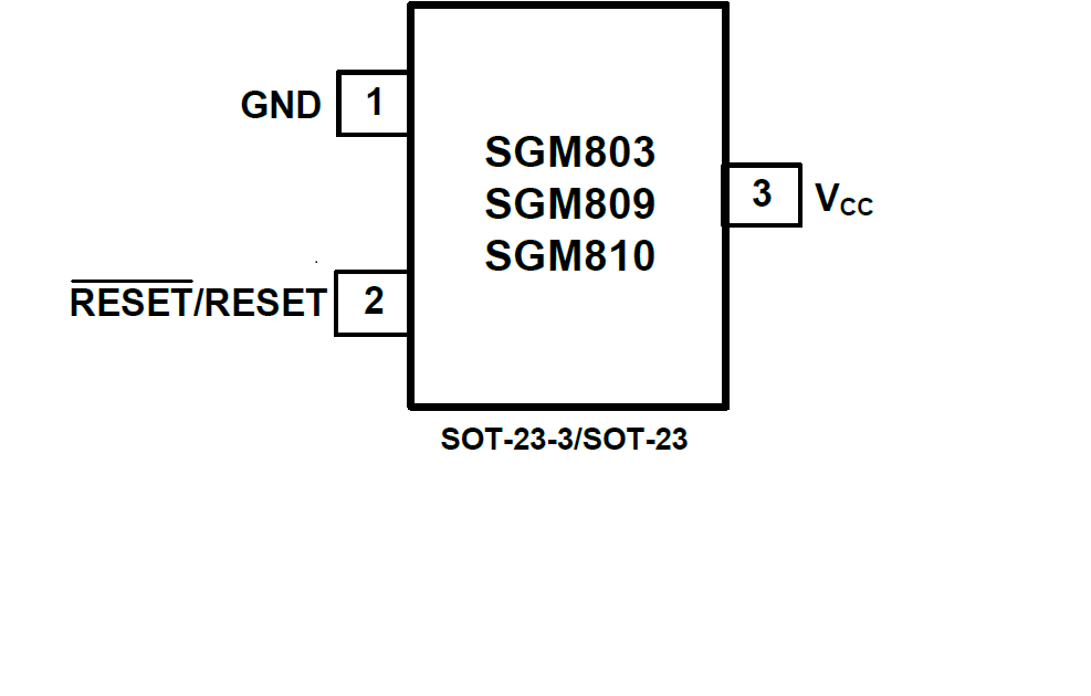 The SGM803/SGM809/SGM810 supervisory circuits monitor the power supply voltage in microprocessor and digital systems. They provide a reset output during power-up, power-down and brownout conditions. On power-up, an internal timer holds reset asserted for 240ms. This holds the microprocessor in a reset state until conditions have stabilized. The RESEToutput remains operational with VCC as low as 1V. The SGM803/ SGM809 provides an active low reset signal (RESET) while the SGM810 provides an active high signal (RESET) output. The SGM809/SGM810 has push-pull outputs, whereas the SGM803 has an open-drain output, which requires an external pull-up resistor.