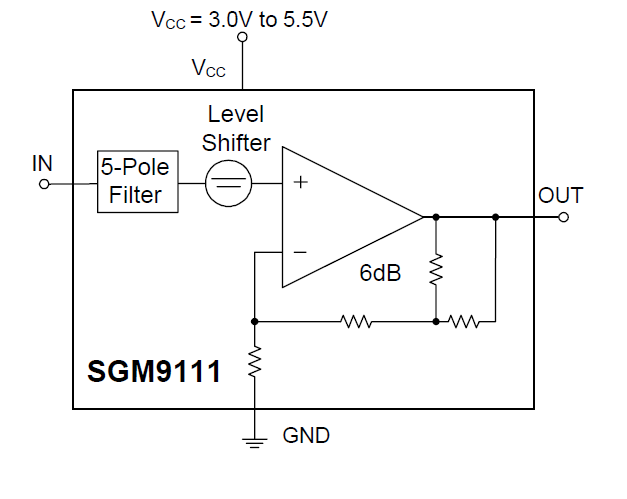 The SGM9111 is single rail-to-rail 5-pole output reconstruction filter with a -3dB bandwidth of 8MHz and a slew rate of 34.8V/μs. Operating from single supplies ranging from 3.0V to 5.5V and sinking an ultra-low 7mA quiescent current, the SGM9111 is ideally suited for low power, battery-operated applications.