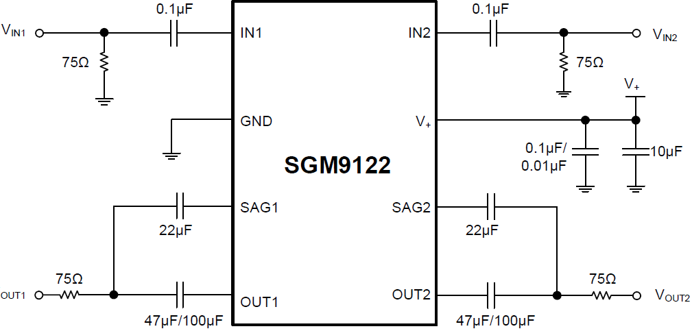 SGM9122 can be DC-coupled or AC-coupled with input video signal, such as the output stage of DAC to eliminate out-of-band noise. The output in SGM9122 can be configured as DC- or AC-coupled output. The SGM9122 has Green TSSOP-8 and WSOP-8 packages. It operates over an ambient temperature range of -40°C to +85°C.