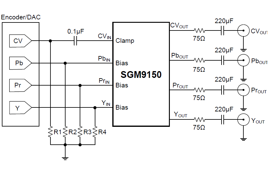 The SGM9150 video filter is intended to replace passive LC filters and drivers with an integrated device. One 6th-order channel offers Standard Definition (SD) filter while the other three channels are High Definition (HDp) filters. The SGM9150 may be directly driven by a DC-coupled DAC output or an AC-coupled signal. Internal clamp and bias circuitry may be used if AC-coupled inputs are required.